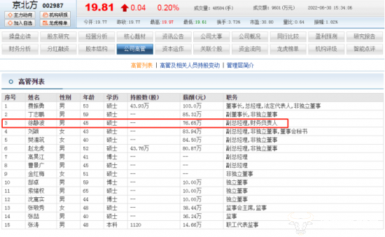据东方财富网数据显示,徐静波在京北方的薪酬为76.65万元,在所有副总当中最低。但其实最高的樊湄筑只为84.50万元,也没有比他高很多。