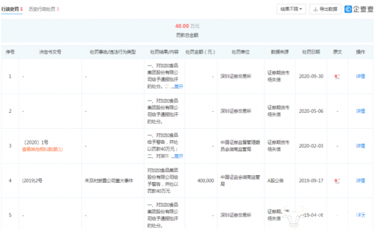 此外,加加食品还曾在2017年分别因环境违法、对商品或者服务作虚假或者引人误解的宣传,各被行政罚款5627元和2.5万元。
