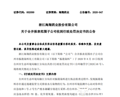 对此,海翔药业宣称,罚款将计入2020年当期损益,不会对公司当期利润产生重大不利影响。振港染料将尽快完成整改,并将整改完成情况上报相关环保部门。