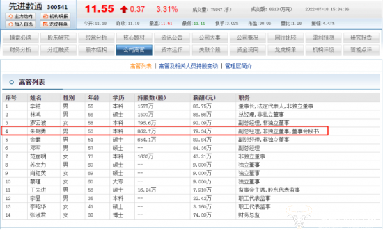 据东方财富网数据显示,朱胡勇在先进数通的薪酬为79.34万元,并且朱胡勇在先进数通持有862.7万的股份,近期先进数通的股票价格基本保持在每股11元左右,相当于市值9000多万元。可见朱胡勇的身价还是非常高的。