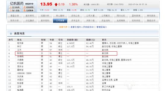 由于近日才上任副总裁,这位女博士的薪酬还暂未公布。根据东方财富网显示,副总裁、非独立董事、董事会秘书冯徳崎的薪酬为48万。其持有公司股份110.6万股,而耿雨红目前没有持股。
