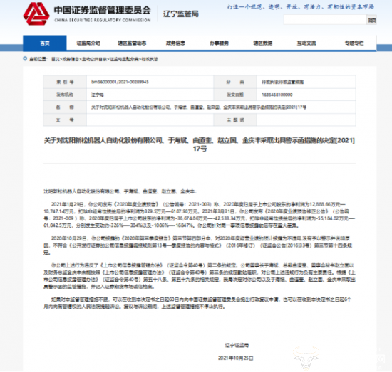 值得一提的是,去年,因信披违规,深交所公布了《关于对沈阳新松机器人自动化股份有限公司及相关当事人给予通报批评处分的决定》,对新松机器人以及原董事长于海斌、时任总裁曲道奎、原财务总监金庆丰给予了通报批评的处分。