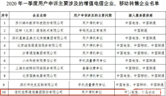 工信部也曾因用户停机争议通报过话机世界。据悉,在2020年,工信部发布了关于电信服务质量的通告 (2020年第2号)暨工信部信管函〔2020〕120号,披露了一季度用户申诉主要涉及的增值电信企业、移动转售企业名单。其中,话机世界因用户停机争议上榜。