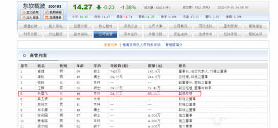 根据东方财富网显示,孙雪飞目前和总经理潘松以及副总经理、董事会秘书王辉一样,均持有公司股份24万股。薪酬为85.11万,比王辉稍多些,但远远比不上潘松的244.5万元的薪酬。