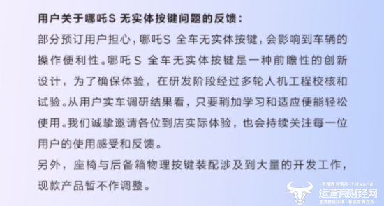 对此,哪吒汽车回应称:全车无实体按键是一种前瞻性的创新设计,只要稍加学习和适应便能轻松使用,以及座椅与后备箱物理按键装配涉及到大量开发工作,为确保及时交付用户,现款产品暂不作调整。