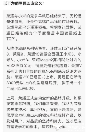 例如:2019年,小米宣布红米品牌独立。当时业内猜测,小米此举将效仿华为、荣耀,拿独立后的红米品牌与荣耀对抗。熊军民对此回应语出惊人,“荣耀的整体销量遥遥领先小米”;“荣耀Magic2的发布让小米MIX3声势全无,销量更是轻松超越”;“荣耀V20更是将他3000元以上的产品远远甩开”等引发网友吐槽。