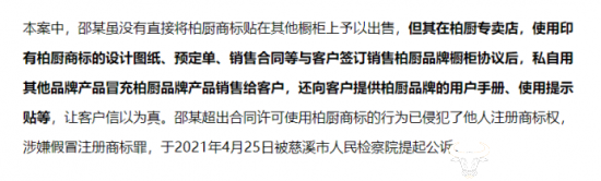 基于那次偷梁换柱未被发现,2019年邵某打算全部用黄某生产的产品冒充柏厨橱柜卖给卢某,结果对方发现质量问题,与柏厨联系,被告知并非柏厨生产。事情败露,邵某被起诉。