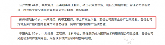 据烽火通信今年公布的2021年度报告摘要显示,熊伟成40岁,高级工程师,博士研究生毕业。曾任公司宽带业务产出线副总裁兼市场部总经理,网络产出线宽带产品线总监。