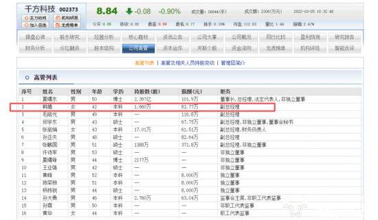 不过,韩婧现在还持有公司1.66万股股份,虽然看起来不多,但是2016年上任副总经理的时候,她只有8300股。