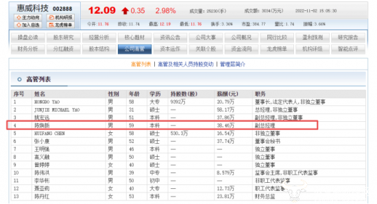 根据东方财富网显示,陈焕新年薪38.46万。另一副总经理,董事长姚洪波的弟弟姚宏远的薪资是37.86万。