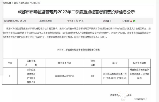 公示内容显示,四川白家阿宽食品产业股份有限公司二季度投诉量165起,投诉主要问题为“所售部分方便食品存在黑点黑斑、异物等问题”。