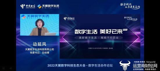 在2022天翼数字科技生态大会举办的同时,数字生活合作论坛同步举行。天翼数字生活科技有限公司总经理边延风作了题为“数字生活,美好已来2023——美好数字生活,赋能千行百业”的演讲。