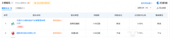 值得一提的是,天眼查APP显示,截至2022年12月27日止,无锡银行完成非公开发行A股股票2.89亿股募集资金净额为19.98亿元。其中,无锡市太湖新城资产经营管理有限公司耗资13.50亿元获配1.95亿股。
