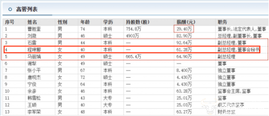 值得一提的是,东方财富网的信息显示,程琳娜曾获得的薪酬为61.28万元,在三位副总经理中薪酬最低,副总石雷的薪酬为92.64万,远高于程琳娜的薪酬。