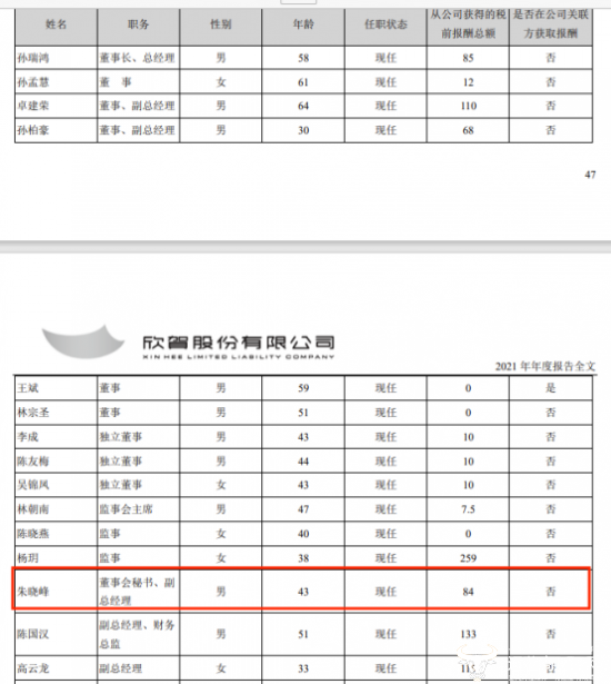 2021年年报显示,朱晓峰在2021年获得的薪酬为84万元,而副总兼财务总监陈国汉的薪酬为133万元,副总高云龙的薪酬为115万元。相比其他两位副总,朱晓峰的薪酬并不高。