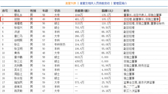 值得一提的是,东方财富网显示,郑阳去年获得的薪酬为105.2万,从整个公司的薪资水平来看,他的待遇还是不错的,公司中获得百万年薪的人屈指可数,除了副总兼董秘谢瑾琨及董事长蔡礼永外,只有郑阳的年薪超过了百万。