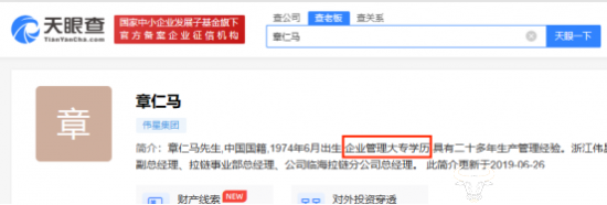 天眼查信息显示,章仁马出生于1974年,按此计算他今年49岁。他是大专学历,学的是企业管理专业。