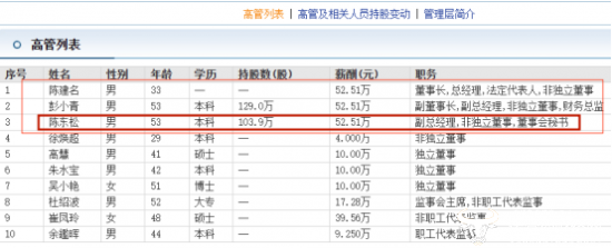 值得一提的是,东方财富网信息显示,陈东松与公司副董事长彭小青的年龄一样,都是53岁,在名臣健康高管团队中已经是年龄最大的高管了。陈东松去年获得的薪酬为52.51万元,与董事长、总经理陈建名的薪酬一样。