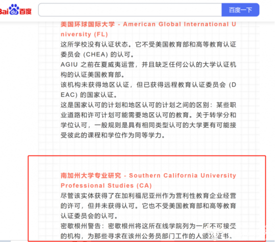 其中称,南加州大学专业研究 - Southern California University Professional Studies (CA)。尽管该实体获得了在加利福尼亚州作为营利性教育企业经营的许可,但并未获得认可。它也不受美国教育部和高等教育认证委员会的认可。