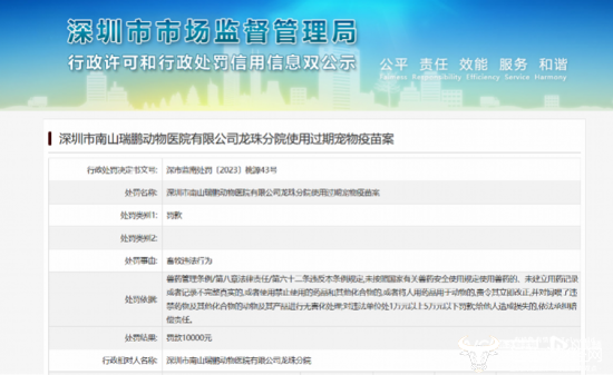 另外,深圳市市场监督管理局的公示信息显示,2023年4月23日,由新瑞鹏全资控股的深圳市南山瑞鹏动物医院有限公司龙珠分院因使用过期宠物疫苗被深圳市市场监管局南山监管局罚款1万元。