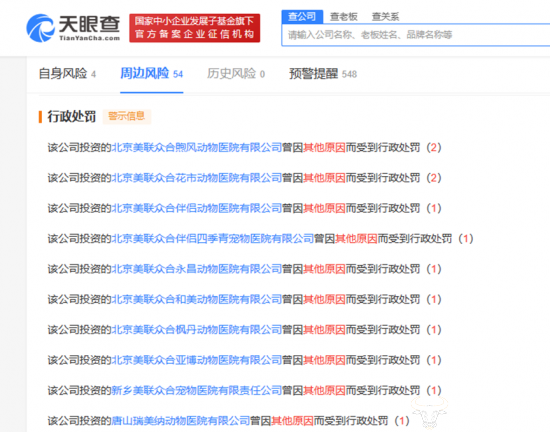 然而,这并不是个例。天眼查信息显示,新瑞鹏旗下美联众合动物医院相关的多家分院在2019年至2023年期间曾多次收到行政处罚。