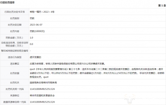 据该行政处罚信息显示,此次资兴电信被处罚的违法行为类型属于“虚开发票的”,违法事实则为“此案为举报案,举报人反映中国电信股份有限公司资兴分公司涉嫌虚开发票。”最终被处以1万元的罚款。