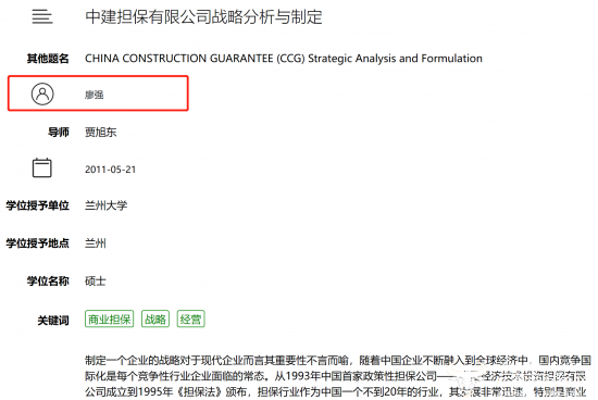 廖强跳槽的频率还是比较高的,他之后在2008年的时候就已经是青岛海尔空调事业本部本部长助理兼华南、西南大区总监了。之后2011年廖强从兰州大学MBA毕业的时候的毕业论文则是《中建担保有限公司战略分析与制定》,此时他已经是深圳中建担保集团总裁了。