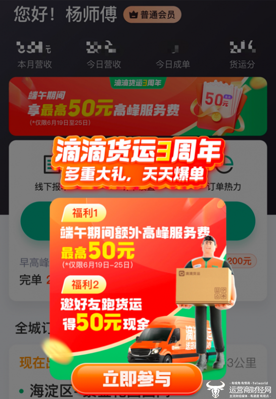 滴滴货运周年庆活动,同时在司机端启动多重激励活动。6月底之前,司机师傅每邀请一位好友成为滴滴货运司机,即可获得50元现金奖励;不同城市还将实时推出多重可叠加的司机激励活动。