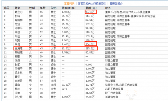 值得一提的是,虽然王海啸的学历在公司高管团队中并不起眼,但是他去年的薪酬高达215.3万元,这个薪酬非常不错,比董事长、总经理戴立忠薪酬的两倍还多。而在已公布薪酬的10位副总中,王海啸的薪酬仅次于公司副总朱健,朱健的薪酬为304.6万元。