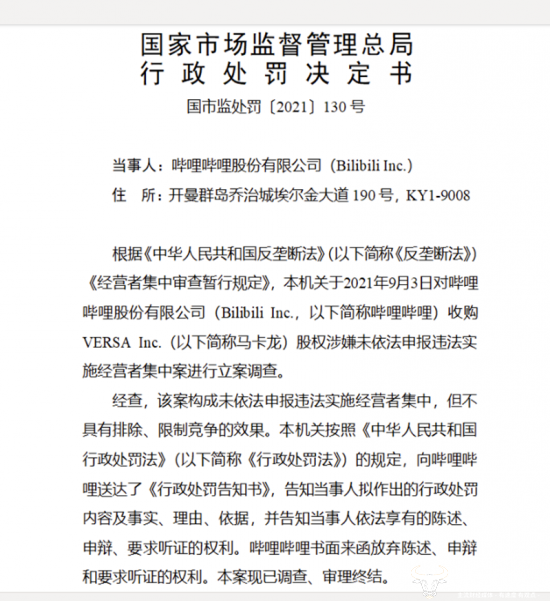 值得注意的是,2021年12月31日,市场监管总局对哔哩哔哩作出行政处罚决定。行政处罚决定书显示,哔哩哔哩收购VERSA Inc.股权,构成未依法申报违法实施经营者集中,但不具有排除、限制竞争的效果,被市场监管总局给予50万元罚款的行政处罚。