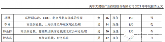 然而,美年健康2021年年报显示,林琳、李林、韩圣群、押志高的年薪都是150万,2022年李林和押志高为什么被降薪了,原因暂不可知。