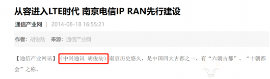 胡俊劼过往在工作中是很低调的,他曾在2014年写了一篇文章,题目为《从容进入LTE时代 南京电信IP RAN先行建设》,主要讲述的是中兴通讯积极参与南京电信LTE承载网络的建设的相关情况。