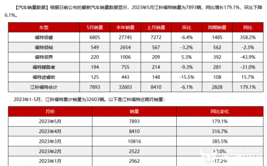 数据显示,今年一季度,江铃福特的国内外整体销量达到了21955辆,同比增长高达72%,其中,国内销量同比增长7.5%,2023年1至5月江铃福特累计销量为32603辆,销量增长非常不错,尤其是出口大增。