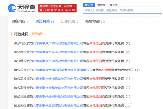 值得注意的是,天眼查信息显示,新瑞鹏旗下美联众合动物医院相关分院在2019年至2023年期间曾多次收到行政处罚。