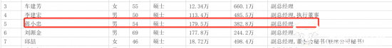 不过在副总经理职务中,蒋小忠的薪酬并不算高,他的薪酬是382.8万元,在5名副总中排名倒数第二,第一是副总经理车建芳660.1万,其次是邱喆的498.4万元,第三是李建宏的485.5万元。