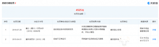 值得关注的是,惠泉啤酒曾受到过两次行政处罚。最近的一次是公司因违反规定条件招用保安员受到惠安县公安局的行政处罚,公司被责令整改并处以警告。而早在2015年,公司曾因设施不正常运行被惠安县环保局处以罚款4525元。