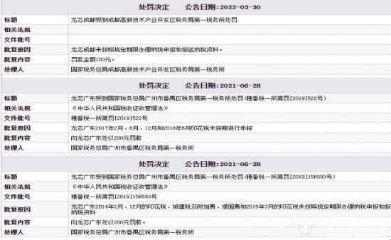 值得一提的是,根据新浪财经网的有关公告显示龙芯在近几年有三则违规记录,分别是在2021年和2022年受到处罚。内容主要是未曾申报税费,导致罚款百元。当然这和身为监事会主席的杨梁没有什么关系。