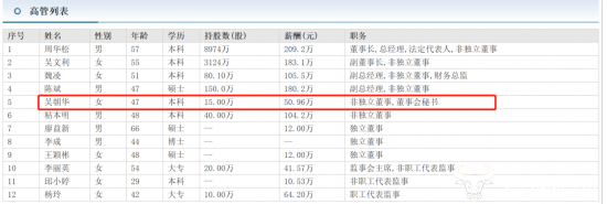 公开资料显示,吴朝华出生于1976年,今年47岁,她和副总经理陈斌同龄。网上虽显示她是本科学历,但她具体的就读高校并没有任何信息披露。
