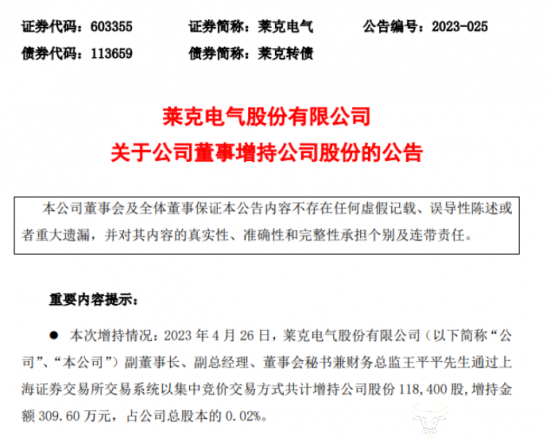 值得关注的是,就在不久之前,莱克电气发布了王平平小幅增持公司股份的公告。据悉,王平平以集中竞价交易方式共计增持公司股份11.84万股,增持金额309.60万元,占公司总股本的0.02%。