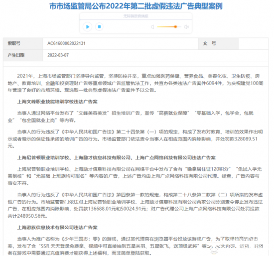 值得注意的是,去年3月7日,上海市市场监管局公布2022年第二批虚假违法广告典型案例。其中就包括游族网络控股子公司上海游族信息技术有限公司。