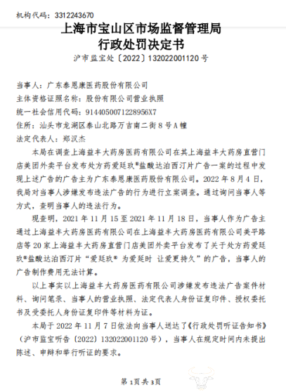 具体来说,处罚文书显示,2021年11月15日至2021年11月18日,广东泰恩康医药股份有限公司作为广告主通过上海益丰大药房医药有限公司在上海益丰大药房医药有限公司美平路店等20家上海益丰大药房直营门店美 团外卖平台发布了关于处方药爱廷玖®盐酸达泊西汀片“爱廷玖® 为爱延时 让爱更持久”的广告。