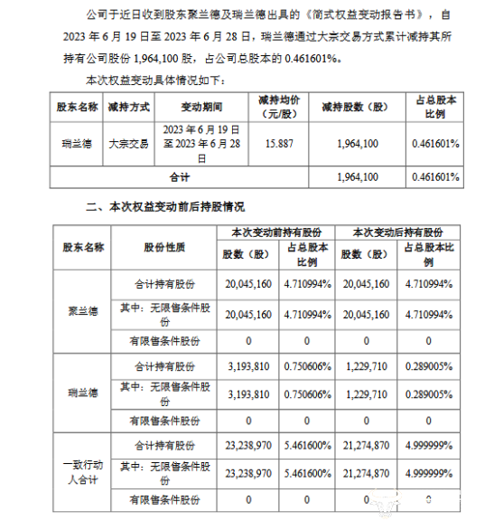 截至6月29日,瑞兰德持有泰恩康1299.71万股,占公司总股本的0.29%。本次权益变动,瑞兰德与公司另一股东聚兰德为一致行动人,减持后两者合计持有2127.49万股,占公司总股本5%。