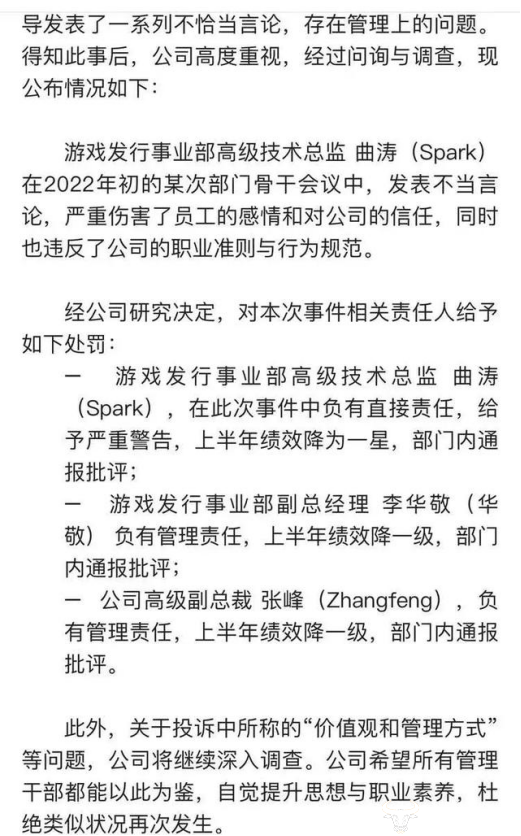 通报称,经研究决定,对本次事件相关责任人给予如下处罚:游戏发行事业部高级技术总监曲涛,在此次事件中负有直接责任,给予严重警告,上半年绩效降为一星,部门内通报批评;游戏发行事业部副总经理李华敬负有管理责任,上半年绩效降一级,部门内通报批评;公司高级副总裁张峰,负有管理责任,上半年绩效降一级,部门内通报批评。