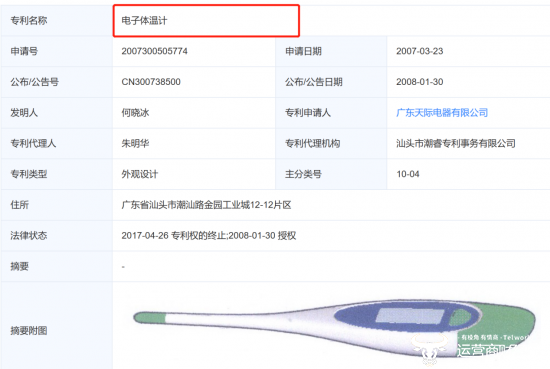 值得一提的是,何晓冰还有发明专利,一般以公司名义申请发明专利的时候,都有好几个发明人,而其中具体的分工或者贡献也无法分辨清楚,但何晓冰的专利中,发明人只有他一个,其专利名称是《电子体温计》,2008年1月30日授权,2017年4月26日专利权终止。