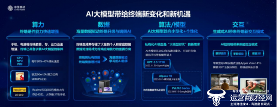AI大模型趋向小型化+个性化为终端智能化发展带来新机遇。手机、电脑等终端生成并存储了海量数据,终端侧私有数据和推理计算将是终端应用能力的重要方向,可直接运行在手机和电脑等智能终端上的私有化AI模型成为“大模型时代”的新需求。