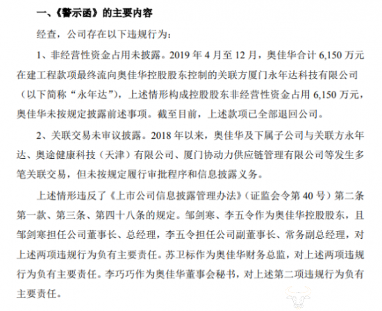 值得一提的是,就在2021年,奥佳华曾发生过两起违规行为,这两起事件皆起因于公司高管未按规定及时披露信息。李五令作为奥佳华控股股东和副董事长对两项违规行为负有主要责任,被证监会出具了《警示函》。