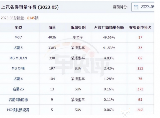 数据显示,名爵MG7在2023年4月份销量为2979辆,5月份销量为4036辆。据了解,名爵MG7是名爵品牌销量最高的车型。