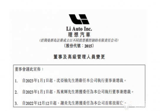 2022年12月,理想汽车官方发布公告称,自2023年1月1日起,将由马东辉接任沈亚楠,担任理想汽车执行董事兼总裁,并整体负责研发和供应链群组;沈亚楠所管理的供应团队(包含供应链、制造、质量)将交由总裁马东辉管理。