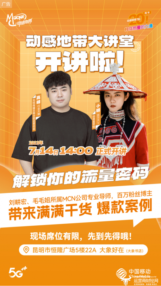 看到这里,相信不少同学都想去听一听大咖分享,获得主播行业的“武功秘籍”。2023年7月14日14:00,云南移动为大家带来的动感地带大课堂将在昆明市恒隆广场5楼22A 大象好在(大象书店)正式开讲!