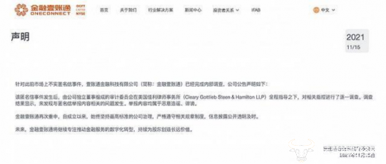 对此,金融壹账通官网发布声明称,针对此前市场上不实匿名信事件,公司已经完成内部调查。调查结果显示,未发现与匿名信举报内容相关的问题发生。举报内容均属于恶意造谣、诽谤。